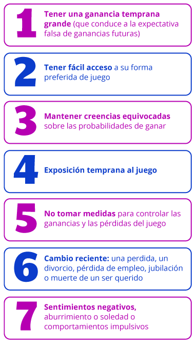 El contacto o la participación precoces en juegos de azar y apuestas (sobre todo cuando una persona muy joven consigue un premio temprano), una personalidad impulsiva o poco dada al autocontrol, jugar más de lo pensado inicialmente (especialmente con el fin de recuperar pérdidas) o no respetar el gasto máximo que se había decidido previamente, por ejemplo, son algunos de estos factores.